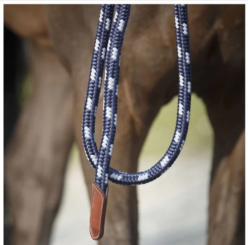 Antarès Lead Rope represents a definite step above the usual nylon lead rope for horses. This round woven nylon lead rope from Antarès has navy and a light blue/grey in a crisp pattern plus quality hardware and fine brown leather trim with cream stitching.