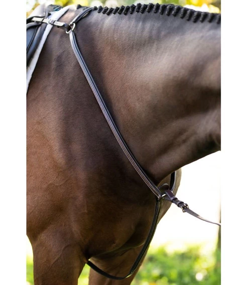 Black Oak Hunter Breastplate with round raising and fancy stitching is part of the affordable Black Oak line from KL Select. Quality details include soft padding at the chest and withers, reliable hardware, and a refined look. The Black Oak Raised Fancy Stitched Hunter Breastplate is available in Cob, Full, and Oversize. If the size you need is currently not in stock, please email or call so we can assist you.