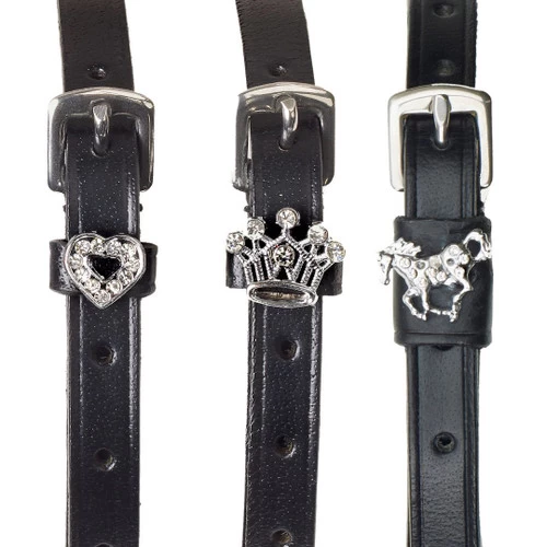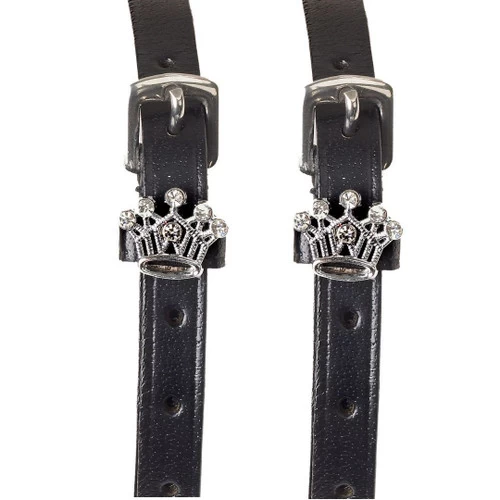 How fun are these?! Jewelry Spur Straps from Camelot add charm and sparkle to a riding basic. Black leather spur straps from Camelot are accented with your choice of a Crown, Heart, or Horse charm with rhinestones.