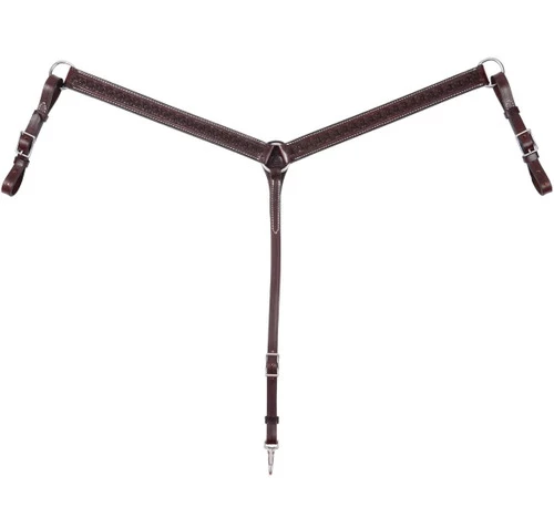 Bluestem Breast Collar is part of The Cowtown Tack Collection at Circle Y. It has straight 1-1/2″ shoulder straps with detailed tooling and white stitching. It is fitted with stainless steel hardware for lasting beauty. The Bluestem Breast Collar matches the Bluestem Browband Quick Change Headstall and Bluestem Foundation Fit Trail Saddle 2611.