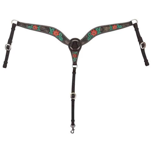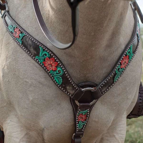Circle Y Cactus Flower Breast Collar will complete your tack set in style. Quality chocolate brown leather features hand carved painted flower filigree overlay and vintage underlay. Stainless steel dots and hardware add up to sturdy construction and beautiful design. The Cactus Flower Filigree Breast Collar is horse sized and can be adjusted to fit most horses.