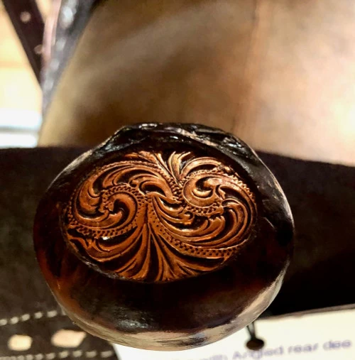 The rich chocolate roughout leather is accented with distinctive cream buckstitch and two rows of cream thread stitching. The chocolate rawhide braided angled Tammy Medium Horn has a stylish copper floral cap. Gorgeous antique copper flower conchos add the perfect finishing touch. This Circle Y HTW Treeless Barrel Saddle is eligible for so you can buy with confidence!