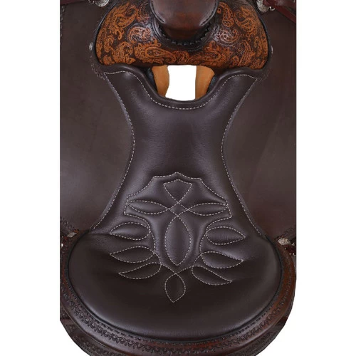 The Circle Y 1154 Paisley Flex2 Trail Saddle has unique hand tooling and all the Circle Y performance features that make it ready to ride. This Western trail saddle is such a beauty with smooth dark leather combined with the two-toned swell and skirt with elegant tooling. The Paisley A Fork Flex2 Wade has really sharp ranch style design plus outstanding comfort for rider and horse.
