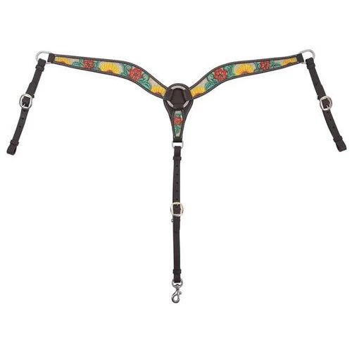 Circle Y Rising Sunflower Breast Collar is a shaped Western breast collar in Chocolate leather with distinctive floral accents. Sturdy contoured breast collar from Circle Y has doubled and stitched pieces with sealed edges. The Rising Sunflower Breast Collar has richly painted flowers on a hand carved overlay plus hand painted sunflowers on the cream leather underlay. It’s fresh and unique for expressing your personal style.