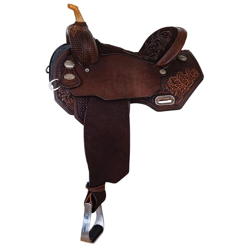 The Circle Y Sarah Rose Vintage Rose Barrel Saddle is a stunner with its angled skirt, streamlined design, and gorgeous hand tooled roses. This Flex2 barrel saddle weighs just 24 pounds and is designed for speed and comfort. The deep secure seat keeps you in a good position and keeps you in close contact with your horse. The rich Vintage color and stitched chocolate seat are simply beautiful.