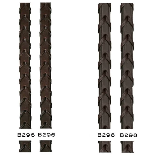 Dy’on Fancy Stitch Laced Reins are beautiful English reins that are perfect for the hunter show ring or for a luxury feel in hand for schooling. Supple vegetable tanned English leather has slightly raised fronts with cream colored fancy stitching. Available in 2 widths. Please consult the product image to see these two reins, featured among other reins from Dy’on. The fancy stitch laced reins are the 3rd and 4th from the left. The B296 style is 1/2 inch wide. The wider B298 style is 5/8″ wide. Both styles have stainless steel buckles.