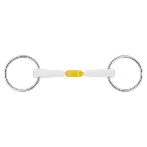 Nathe Double Jointed Small Loose Ring Bit has a plastic center link, similar to a French link, that increases pressure on the edges of the tongue and lower jaw. Classical training bit is mouth and tongue friendly and delivers a direct and precise impact for clarity. The rings are threaded through copper for durability. The Nathe Double Jointed Snaffle Loose Ring Bit is not eligible for the Mary’s Bit Rental program due to the mouthpiece materials. If you need assistance and bitting advice for your horse, call or email the experts at Mary’s. We are here to help!