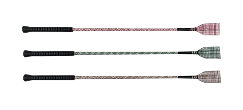 Plaid Jump Bat proves that riding crops don’t have to be boring. The Plaid Jump Bat offers a bit of color and pattern while maintaining a sophisticated, classy look. The shaft and rubber popper are covered in a metallic plaid pattern, available in Brown, Red, or Green. Popper is 1/5″ wide. The grip is a grooved firm rubber that is sturdy and has an integrated cap design. Crops in unique colors and patterns are a smart way to set yours apart from the others at the barn, helping you hang onto your riding equipment. The Plaid Jump Bat measures 18″ long.