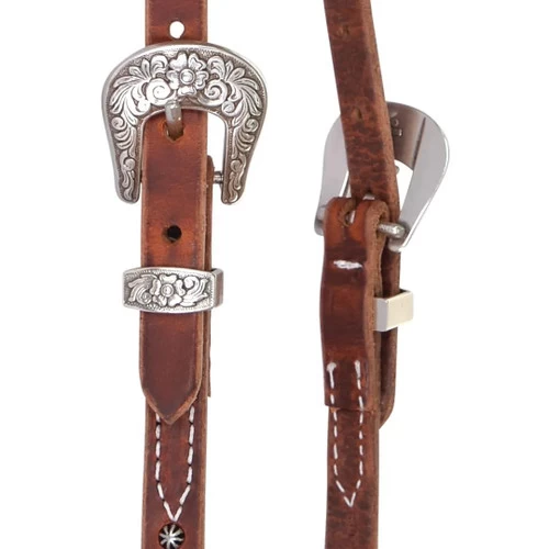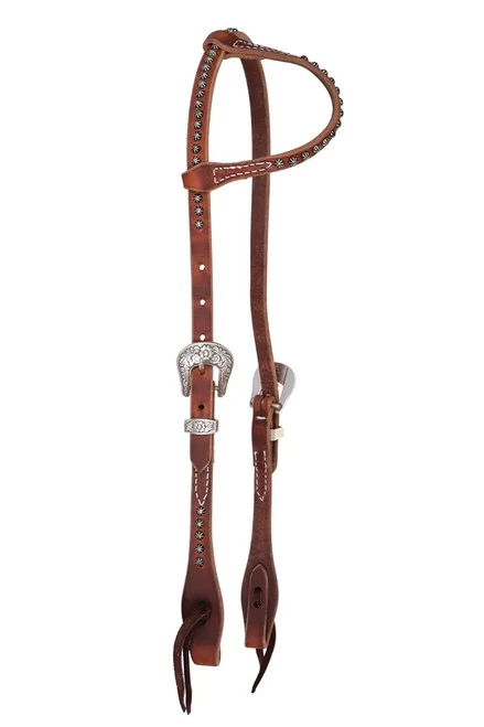 The Reinsman Rosewood and Spots One Ear Headstall has standard cheeks and latigo bit ties. The crown, cheeks, and ear have spots and the headstall is finished with elegant floral engraved buckle sets. Reinsman Rosewood and Spots One Ear Headstall is Horse sized to fit most.