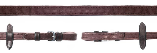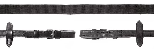 Schockemohle Durasoft Grip Reins with Stops feature beautiful leather and rubberized layer underneath for superb looks and performance. Grippy jumper reins from Schockemohle Sports are reinforced with a pure nylon webbing inside that makes these grip reins extremely resistant to tearing and breakage. Handsome and durable with stainless steel buckles and high quality smooth leather. Available in Black and Espresso, a dark brown shade. Durasoft rubber lined reins have 9 hand stops on each side that are nicely integrated into the rein design and adjustable sliding rein stops or a running martingale. The combination of quality leather, reinforced interior, and rubberized layer make these Schockemohle reins perfect for showing. Full size – 55″.