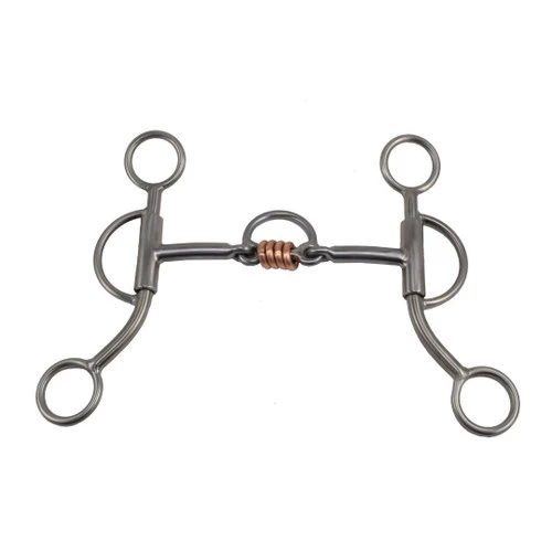 The 4 Runner has a Medium S shank in handsome satin finish. The unique mouthpiece is double jointed with a half circle low port and is curved to lie evenly across the tongue. The center piece has four copper rollers. This bit offers independent action, tongue pressure, bar pressure, and some palate pressure. Copper rollers encourage salivation.