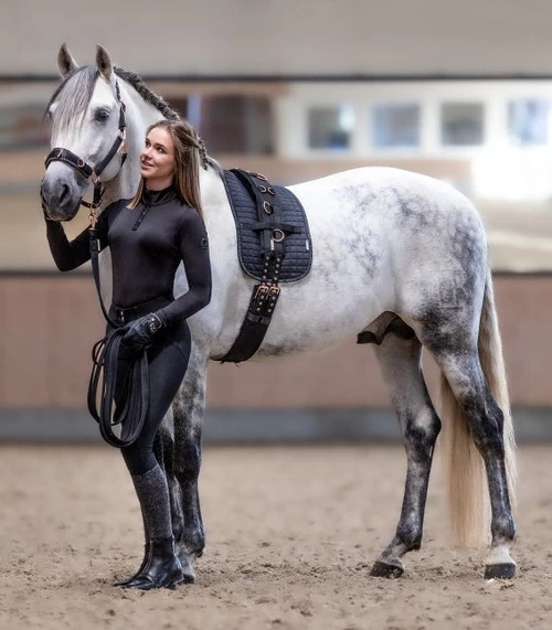 This AWA Quilted Surcingle Pad is a comfortable pad to put under your horse’s lunging surcingle. This long, narrow horse pad has 15 mm thick padding and is beautifully cross-quilted. Made of breathable, durable, soft, form-retaining material. Velcro straps for attaching to and securing the lunging surcingle. Shell material is 65% polyester, 35% cotton; inner layer has 300g polyfill. Black. One size. Pad only. Lunging surcingle and equipment not included.