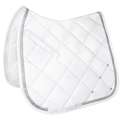 Waldhausen Competition Saddle Pad for dressage has a thin 8mm layer of polyurethane foam plus polyester padding to give cushioning without bulk. It also helps the pad keep its shape. Classy and elegant, the Waldhausen Competition Dressage Pad comes in Black with black shimmer trim or White with silver shimmer trim.