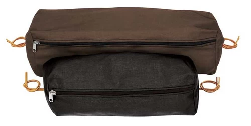 Rectangular nylon cantle bag is a super carrier for bringing along camera, snacks, and more on trail rides! Small measures 5″W x 15.5″L x 6″D. Attaches to saddle with sewn-in dees & tie strings. Nickel plated hardware. Black or Brown nylon.