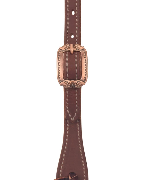 Weaver Saltlick Bar Slim Browband Headstall feels broken-in from the first ride thanks to harness leather that is dipped in oil, dressed with saddle butter, and hand rubbed to a fine finish. This makes it more tolerant of weather conditions as well as horse sweat and dirt. The Jeremiah Watt zinc die-cast hardware is engraved with a lovely flower accent and a zigzag border to add signature style to this Pro Tack Western headstall.