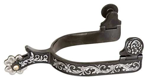 From Weaver, the Scroll Spur with Clover Rowel is lovely and unique.These gorgeous ladies Western spurs have “lucky spurs” written all over them! Check out the pretty silver rowel in four leaf clover design. Elegant, classic spur in antique black steel with engraved silver filigree vine pattern. Spurs have a 1 3/4″ shank and 5/8″ band. Beautiful horse show spur for ladies.
