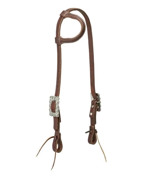 Sturdy Working Tack One Ear Headstall has extra style with the antique nickel-plated hardware. The stunning scalloped square buckles are embossed and etched with a Southwest design. Tie bit ends allow quick bit changes. This Weaver Southwest Square Buckle Sliding Ear Western horse headstall has a nice traditional look with distinctive hardware for extra style.