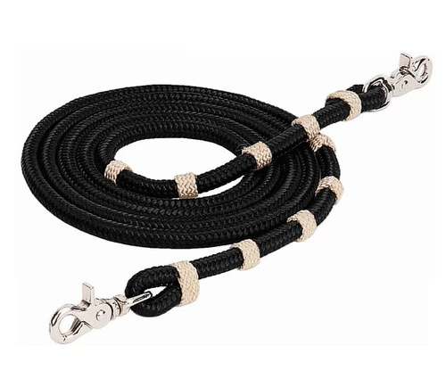 Vaquero Roper Rein is practical and stylish with a retro look and top Weaver quality. Classic roping rein in 8 ft. length has braided overlay buttons in contrasting tan color. Braided nylon single rein can be used for roping and general Western riding.