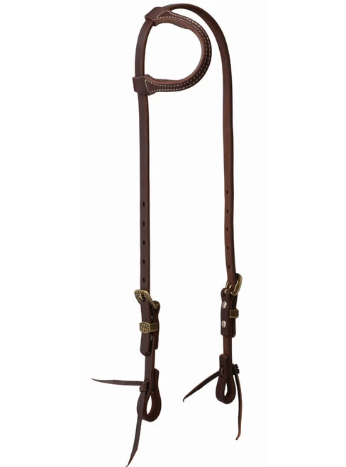 Weaver Vintage Heel One Ear Headstall from the Working Tack Collection aims to please with rich Rose Harness oil finish and a gorgeous designer buckle set. Weaver Leather Western headstall has a sliding single ear and tie bit ends.